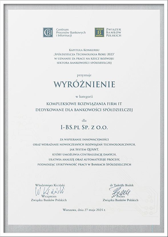 Z ogromną radością informujemy, że nasza firma I-BS.pl została wyróżniona podczas Forum Technologii Bankowości Spółdzielczej (FTBS) za innowacyjną platformę QUANT!